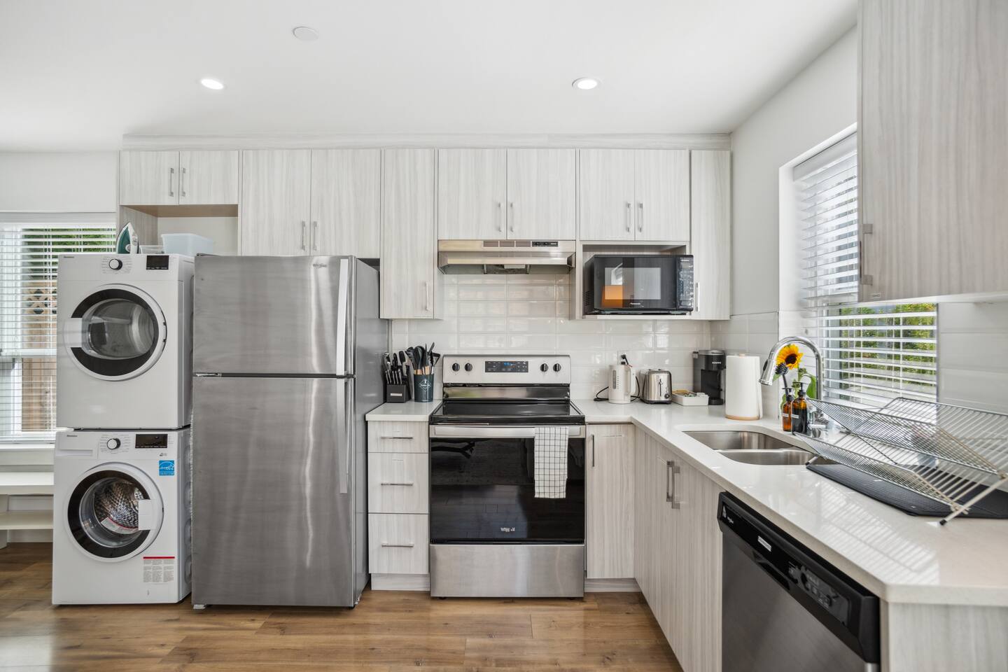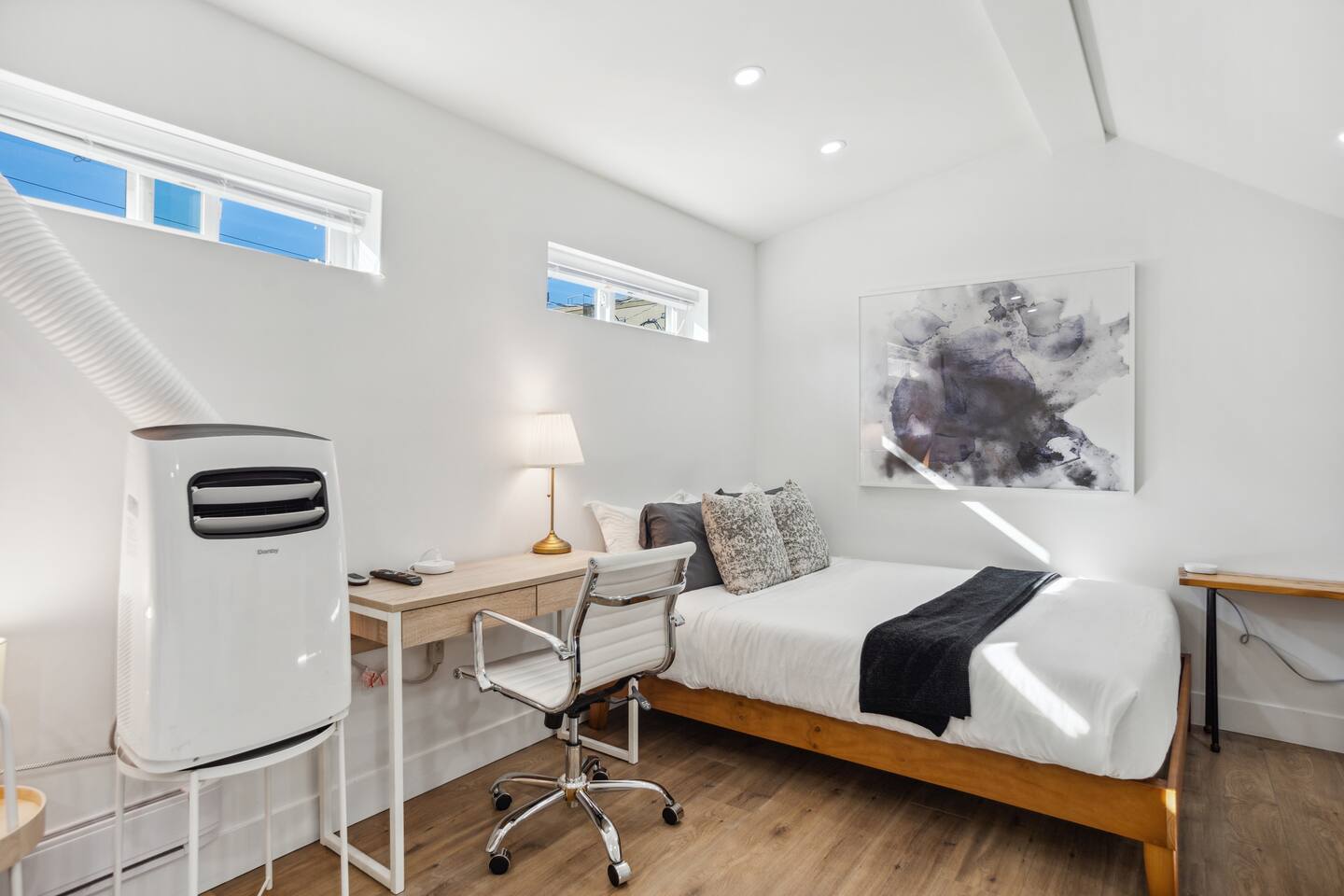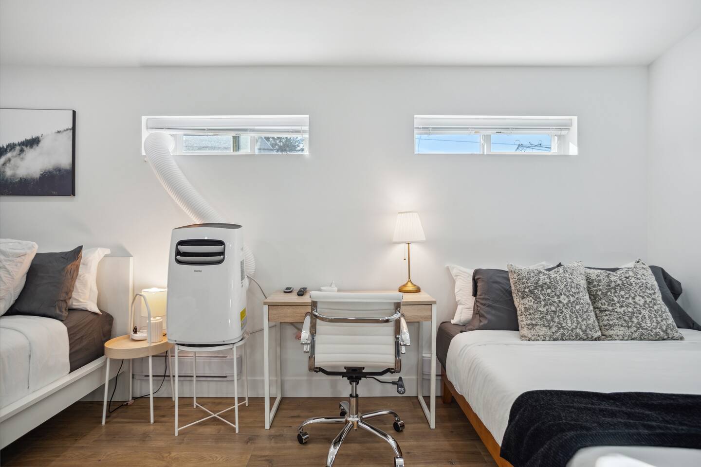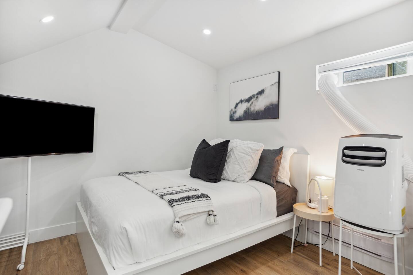 This charming two-level home is designed with comfort in mind, offering plenty of space for relaxation after a day of sightseeing. Bedroom Located upstairs for added privacy 2 comfortable queen beds with fresh linens and extra pillows Living Room Queen-size sofa bed for additional guests Smart TV compatible with your favorite streaming services Dedicated workspace for remote work or study Kitchen Fully equipped with modern appliances including a Nespresso espresso machine Stocked with cooking basics, dishes, silverware, and wine glasses Bathroom Full bathroom with shower, stocked with shampoo, conditioner, and body wash Fresh towels and a hair dryer provided Climate & Comfort Heating for cooler months Portable air conditioning unit available for summer comfort Laundry Washer and dryer available for guest use Location Highlights Walking distance to Queen Elizabeth Park and nearby green spaces Easy access to public transit for exploring Vancouver Close to shops, restaurants, and cafes